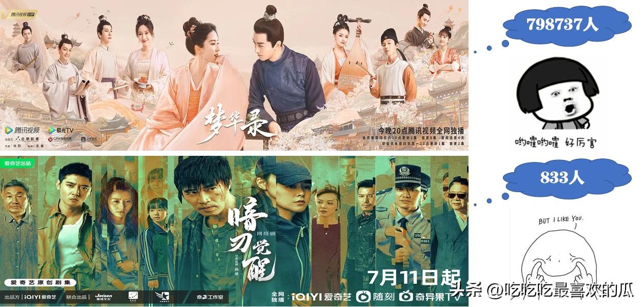 ★按评分人数看,最多人数为《梦华录》798737人,最少人数为《暗刃觉醒》833人。