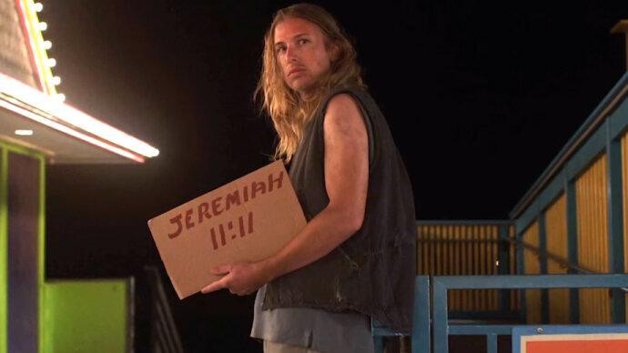 对我们来说,11 11代表着光棍节的网路购物热潮;对《我们》来说,11 11则是呼应着剧情主轴的圣经章节。游乐园里的流浪汉,手持的牌子写着《耶利米书11章11节》,内文如下: