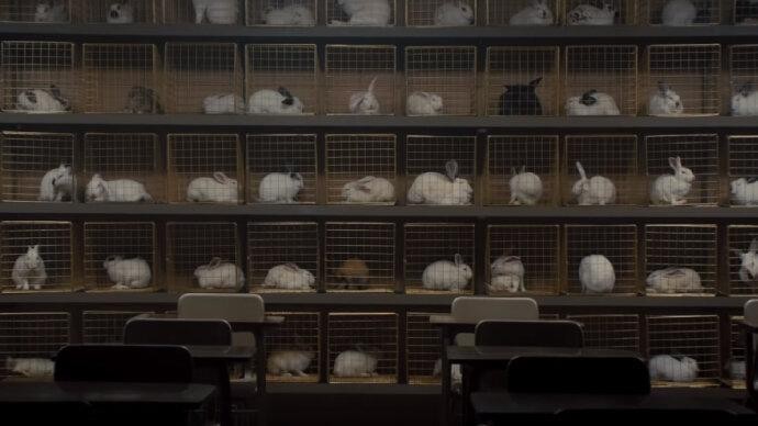 除了老鼠之外,兔子也是科学界常用的试验对象。片头一排排笼中兔的长镜头,反映了以它们为食的影子们,其实自己也是实验室的产物。