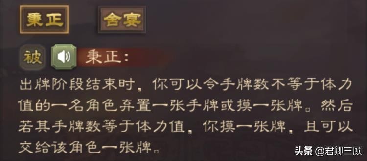 【秉正】这个技能可以在自己出牌阶段结束时,选择弃置一张手牌或摸一张牌,如果他的手牌数量等于其体力值,那么董允就可以摸一张牌。这个技能既可以帮助队友与自己摸牌,也可以让对手掉牌,是一个拉开我方势力与敌方势力牌差的技能。