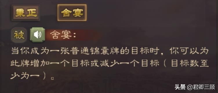 很明显,【舍宴】是一个针对普通锦囊牌的防御技与“加强技”。当场上存活玩家的人数大于2时,【万箭齐发】、【南蛮入侵】在董允面前都可以减少一个目标。而当董允被【顺手牵羊】、【过河拆桥】或者自己使用【无中生有】时,在一般情况下都可以额外增加一个目标使用。