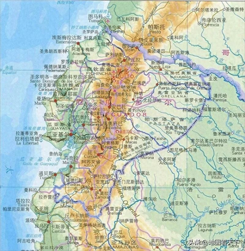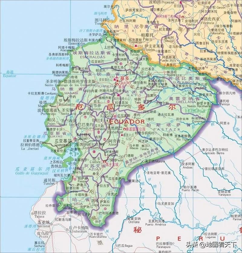 厄瓜多尔位于南美洲西海岸,西临太平洋,东南与秘鲁毗邻,东北与哥伦比亚接壤。海岸线长930公里。国土面积256370平方公里。总人口1693.8万。