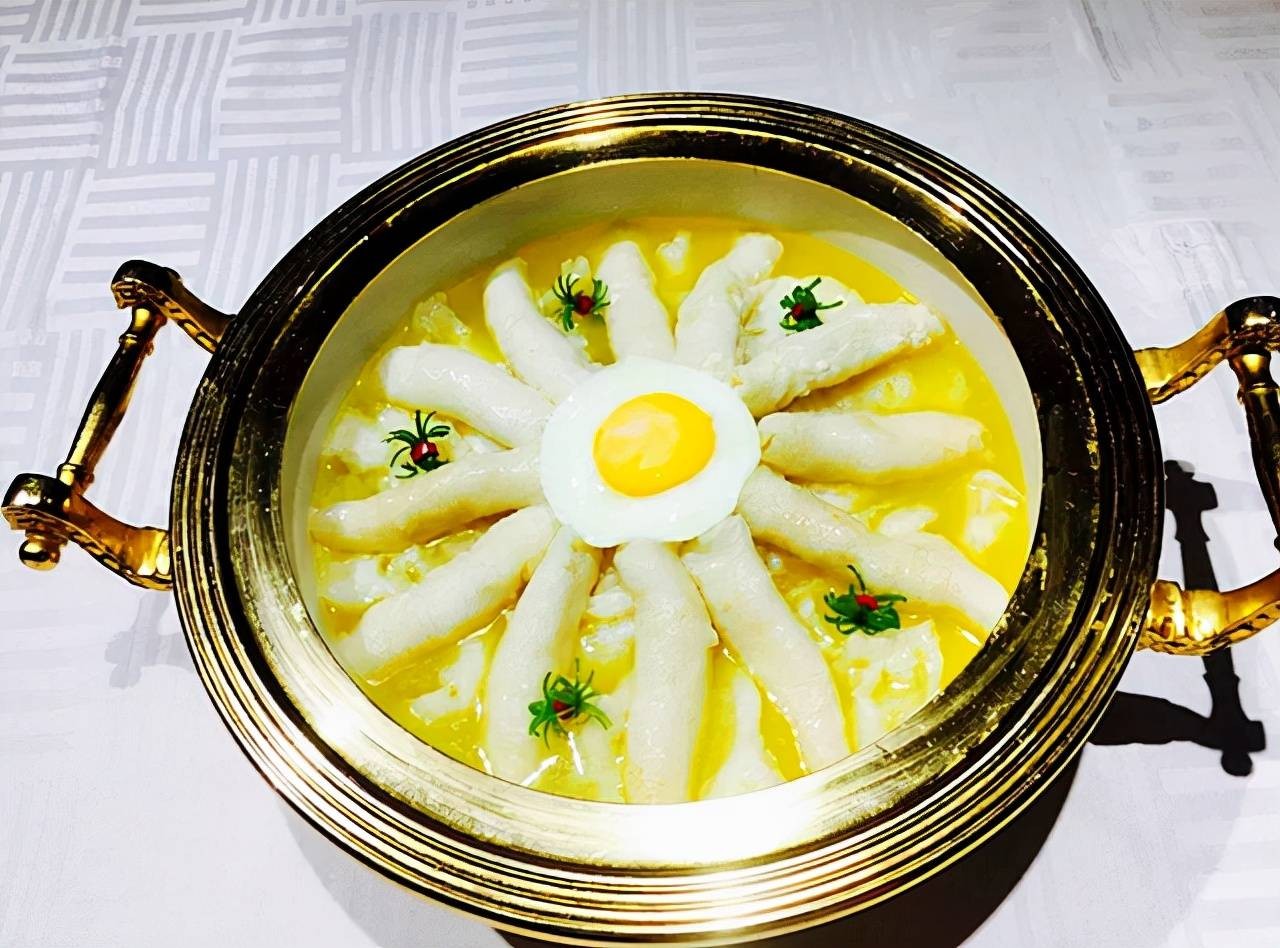 鱼唇、绍兴酒、鸡脯肉、火腿末。