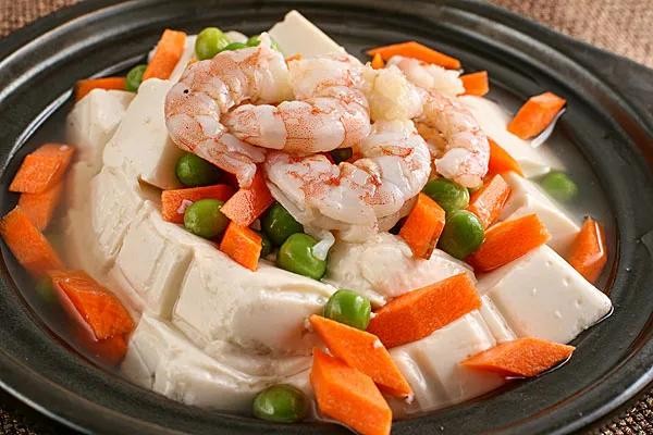 3 .锅内放入浓鸡汤、豆腐块、胡萝卜丁、料酒、盐,大火烧沸,改用小火炖10分钟,放豌豆米、虾仁煮沸.撇净浮沫,加人醋、味精、葱椒油即可。