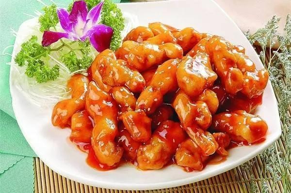 3 .炒锅放植物油烧至五成热,放入红柿子椒块翻炒,放入炸过的肉条、盐、白砂糖、高汤、醋、酱油,用水淀粉勾芡即可。