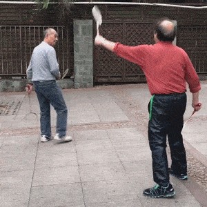 在公园遇到的两位大神!原来羽毛球也可以手脚并用