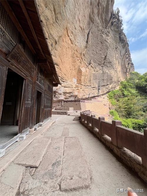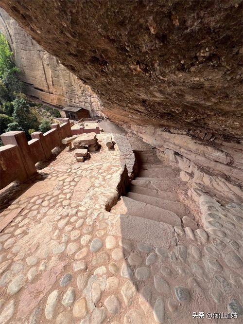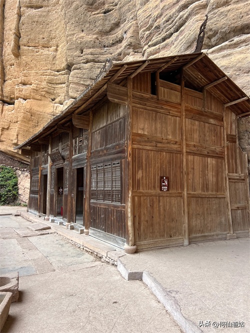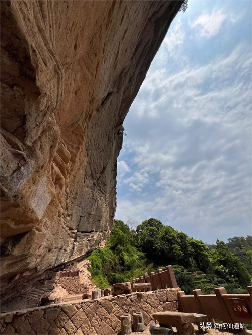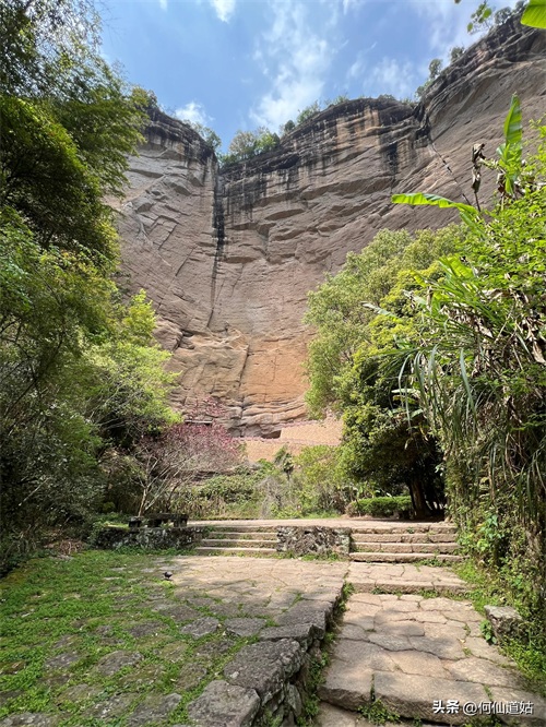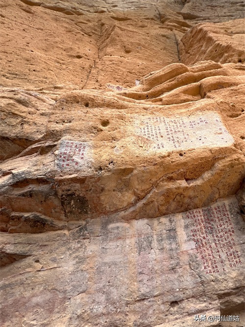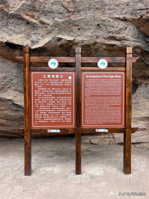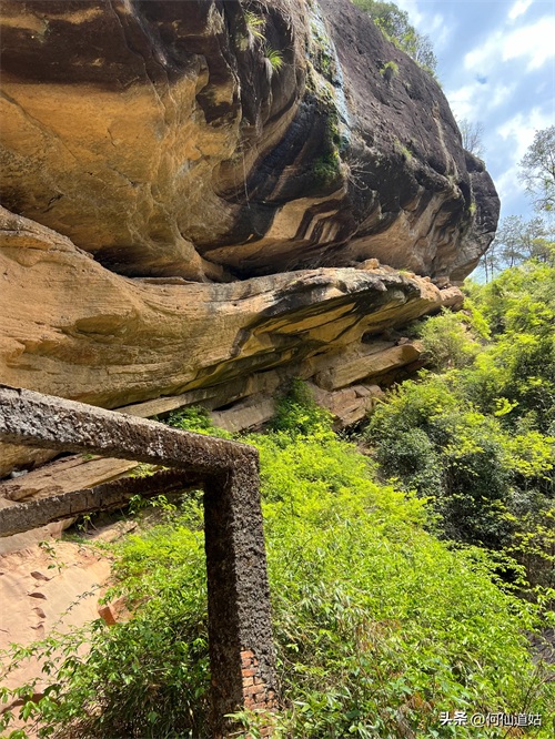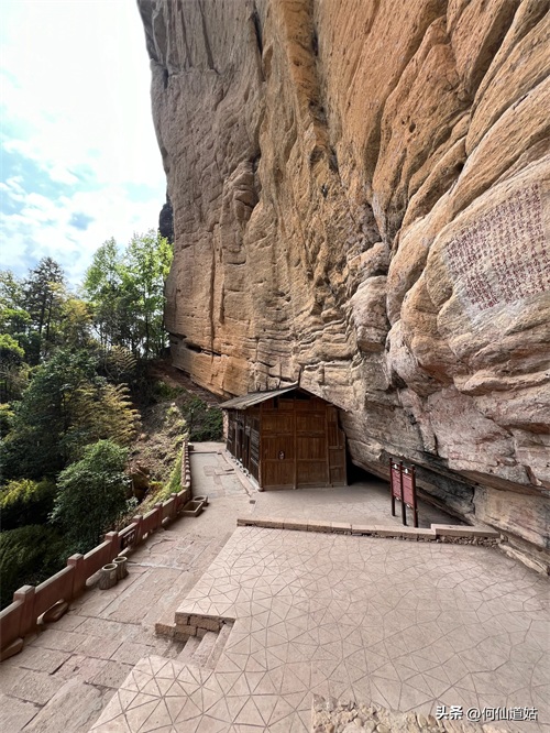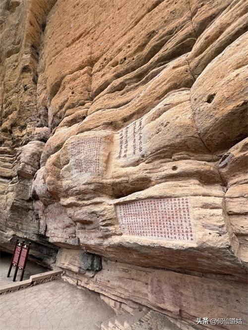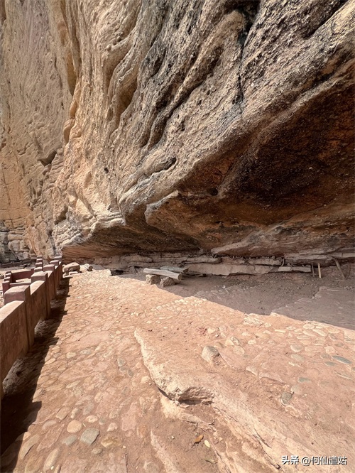 水潭旁边向上望,觉得洞口不高,但登上去要十来分钟。洞口实际是赤壁的凹口,像一个屋檐,长度可能百多米,由于没有雨水,干巴巴的,地面铺了一层面粉般的淡红砂石,犹如到了沙漠。左侧则有一座三贤祠,奉祀宋朝大儒刘子恽、朱熹、刘珙的三贤祠,是奉祀孔子、老子、释迦牟尼的三教堂的遗址。曾是一个名扬天下的地方,因为朱熹在此论道过。