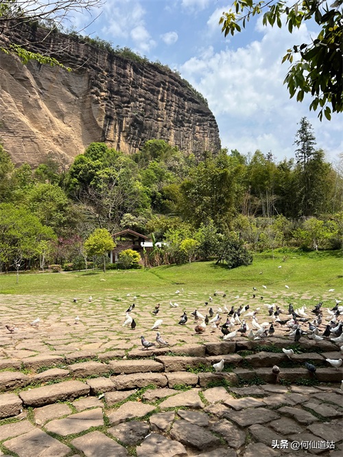 到了山脚,便是上山路,大约三百多米,挺陡的路,间中有台阶,上去后是一个草坪,一个小伙子养了一群鸽子,若是买他一把饲料引诱,则鸽子会飞到你手臂或肩膀上,或者煽动着翅膀在你手心里啄食,让你拍出各种精彩的作品。