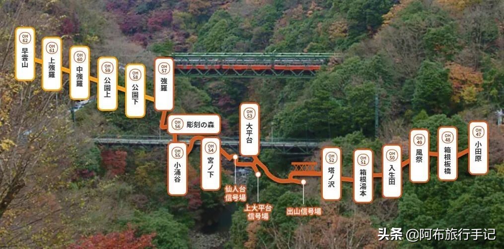 对于初次去箱根的游客来说,如果想快速了解这个地方,那就看这条登山电车的路线图好了。因为它每个车站附近,都能发现有意思的地方,将这些车站串起来,就是一条设计好的箱根旅游路线。