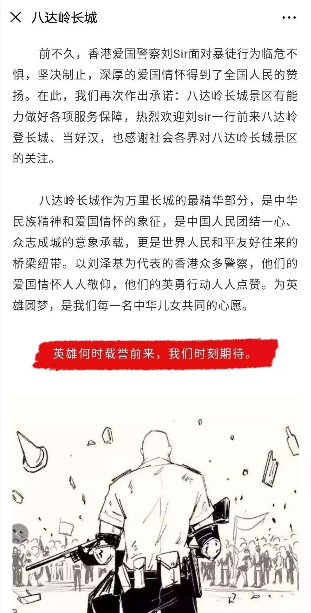 八达岭长城16日通过官方微信向刘sir发出邀请,热烈欢迎刘sir一行前来登长城。文章还表示,从2019年6月1日起八达岭长城景区实施“限流”措施,单日售票不超过6.5万人次,景区有能力保障游客的旅游质量和舒适度。