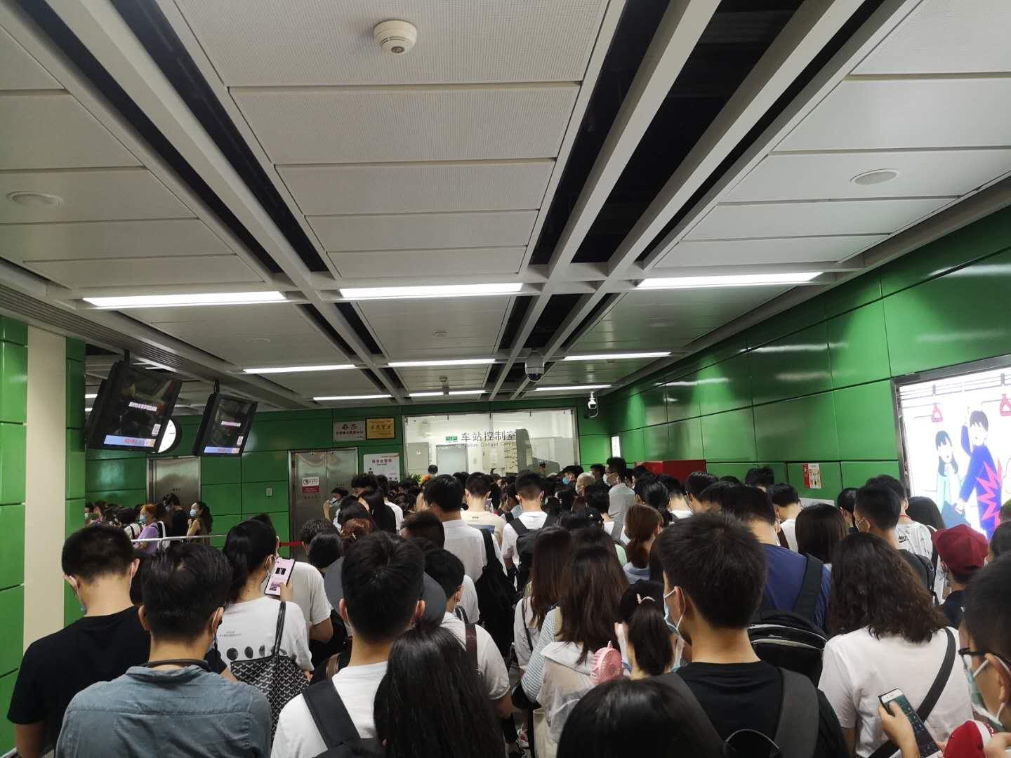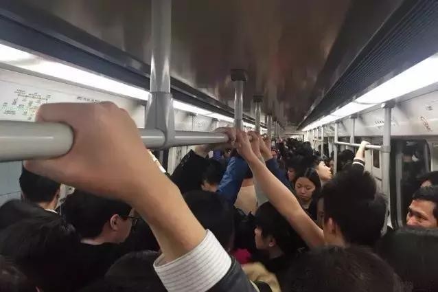 通过漫长的等待队伍只是第一关,接下来还有排队下电梯和贴紧人群挤上车这两关。