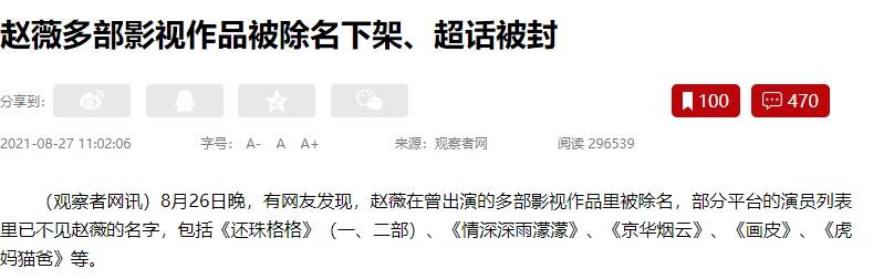 以上信息来源:观察者网2021年8月27日“赵薇多部影视作品被除名下架、超话被封”