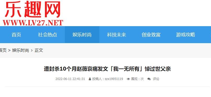 以上信息来源:乐趣网2022年6月11日“遭封杀10个月赵薇哀痛发文「我一无所有」悼过世父亲”