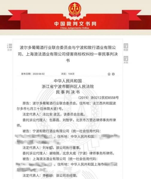 对波尔多葡萄酒行业联合委员会(CIVB)而言,最近取得一系列打击侵权的成果。5月25日,宁波一法院一审判决CIVB在与宁波和上海的两家酒企的侵犯商标权纠纷案中胜诉。