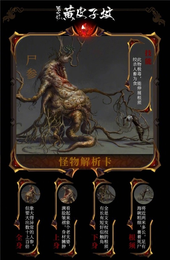 这种非动物非植物类的生物,喜欢生活在阴暗潮湿的地方,如地下室,古墓旁,能伸展根须绞杀人畜为食,宛然一株巨大的食人草,如果挖开地面掘出这株植物,无论人畜,一旦触其毒气则必死无疑。