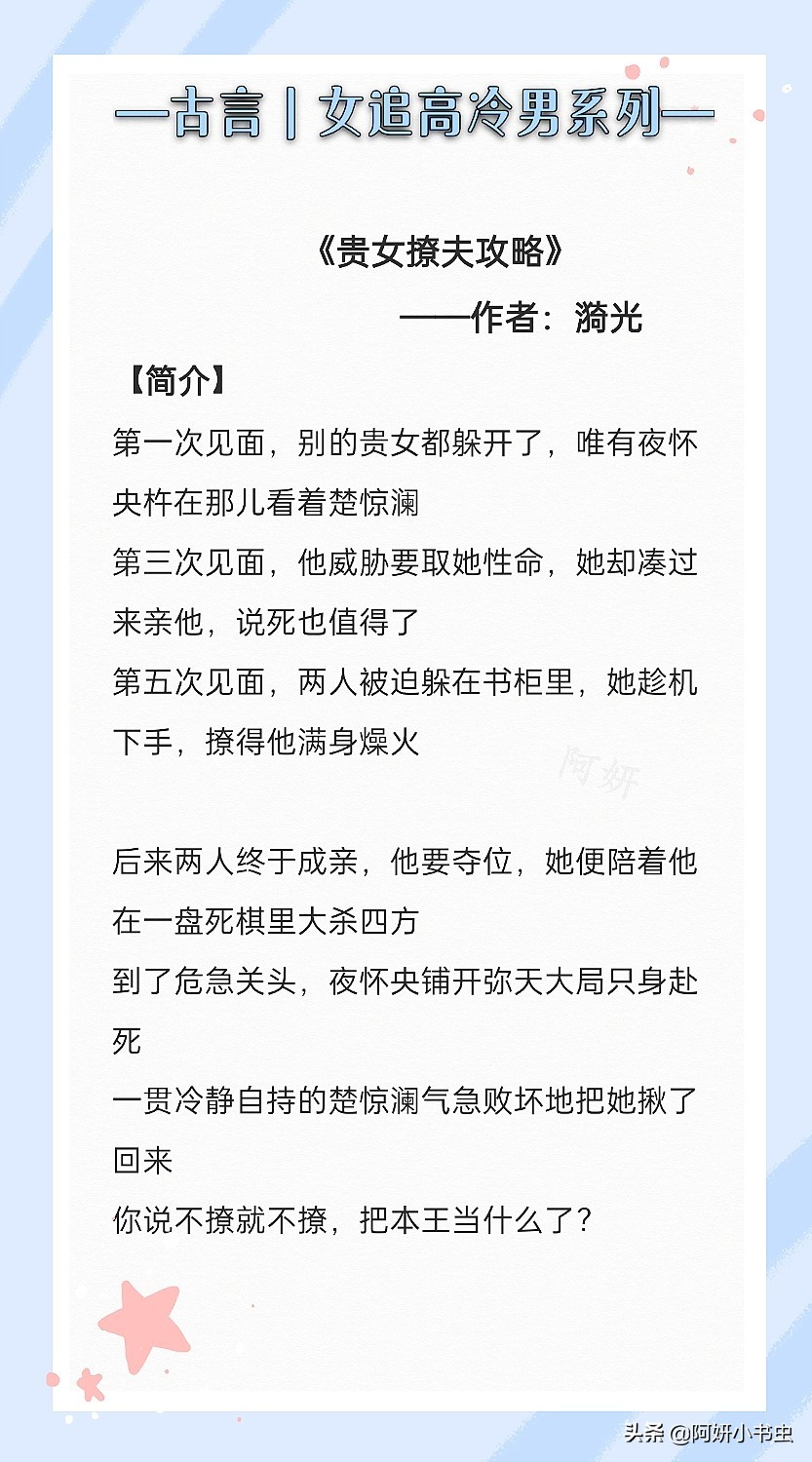 今天推荐的是:3本女追高冷男古言文!俗话说男追女隔层山,女追男隔层纱。只要脸皮厚,不怕闷骚高冷男神不上钩!今天的文都是女主看中男主,然后疯狂狂追,撩拨走一波~虽然基调是轻松的,但描述了暗恋中的追求那种心酸的情绪。不是虐文的小说,我看了却也红了眼。男主傲娇死不认爱,其实内心早已非女主不可,只是苦了女主。后期男主花式追妻。看的时候很爽。文笔都很不错!强推!!热门女追男的小说《春日宴》《咬定卿卿不放松》《表妹万福》等,很好看,一定要去看!