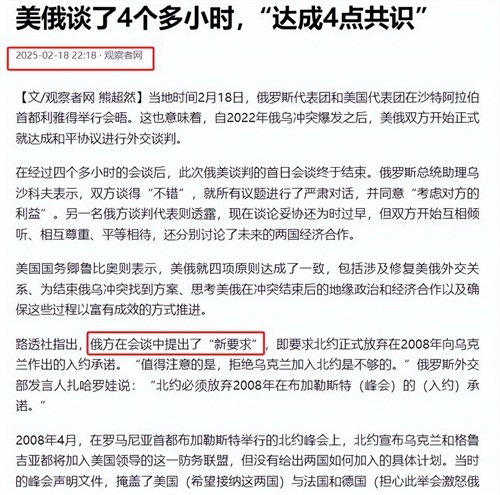 先来说美俄会谈。2月18日,沙特成了俄乌问题的外交主场,美国和俄罗斯的代表终于在这里坐到了一起,对俄乌和平谈判及美俄缓和展开了首次正面对话。绕不开的重点来了:在这次会谈中,俄罗斯直接向北约提出了一个关键要求——取消乌克兰的入约承诺!