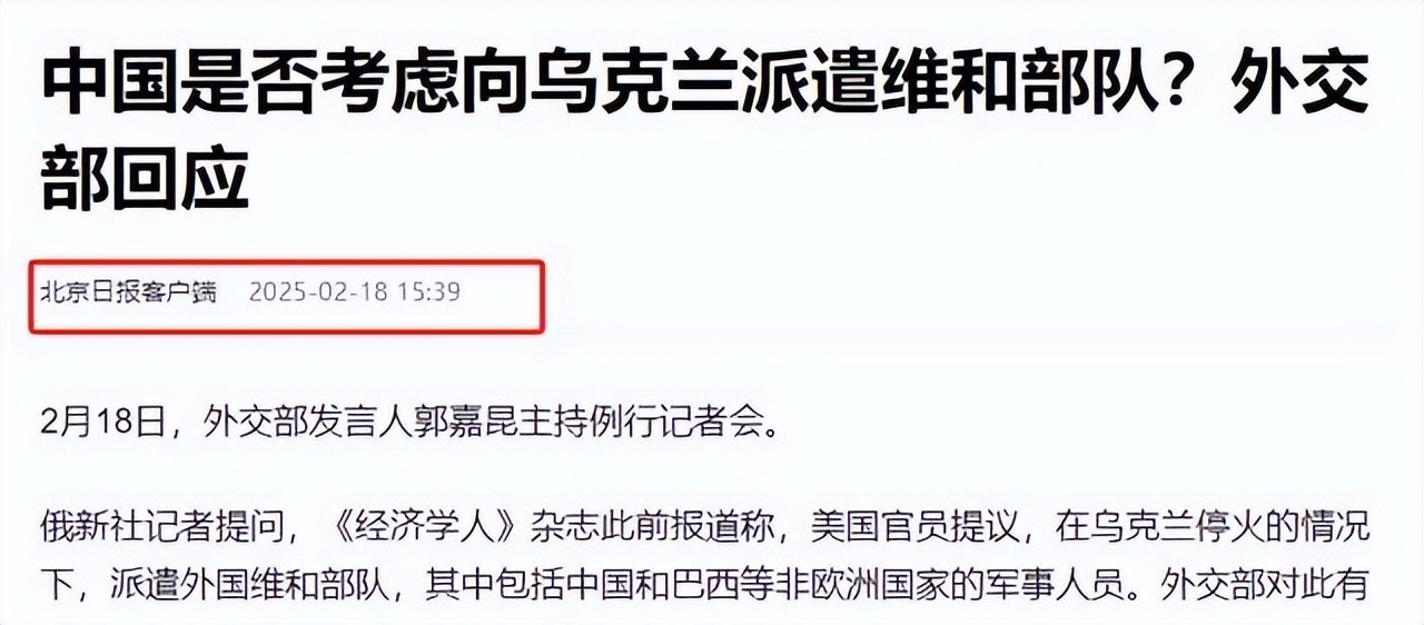 这时候,另一件让人意想不到的事发生了。美国一官员突然提议:如果乌克兰停火,能不能让中国出面,派维和部队去驻扎俄乌边境?这话一出,直接炸开锅了。有媒体赶紧在中国外交部例行发布会上提问,外交发言人郭嘉昆的回应很干脆:“对于假设性问题,不作评论。”