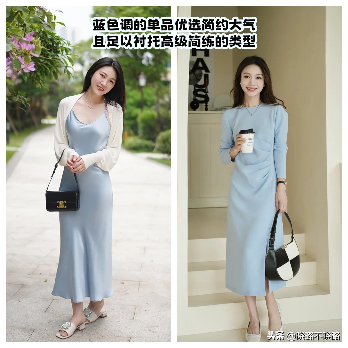 蓝色调的搭配单品其实就很建议大家可以将材质多注重一点,能够穿出富有气质的优势效果也是很有必要的哦,例如像醋酸、缎面的材质本身就具有一些小量的反光效果,衬托的蓝色调更为显白了很多,或者百搭舒适的棉麻面料垂感更重一些呢。