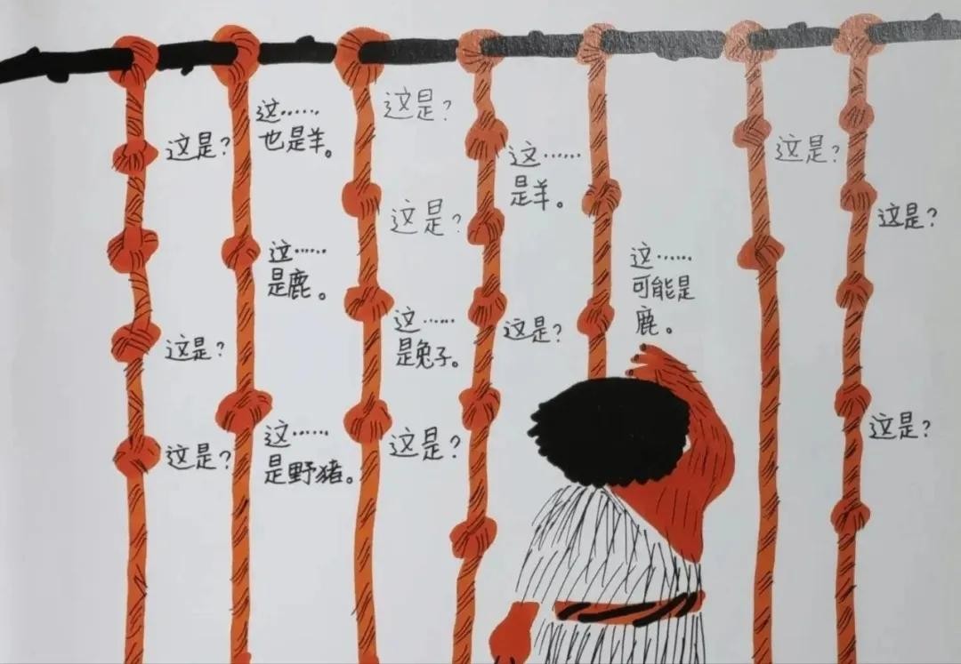 燧人氏用柔软而有韧性的树皮搓成细绳,然后将数十条细绳排列整齐悬挂在一处,在上边打结记事。大事打大结,小事打小结,先发生的事打在里边,后发生的事打在外边。