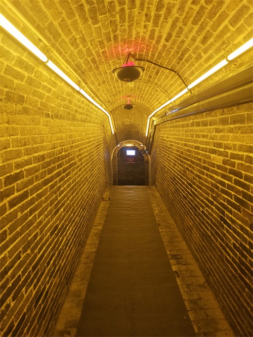 地道内,尽管有电灯照明,由于位于地下,不见天日,仍让人觉得光线阴暗,在这样一个封闭的空间里,只有地道墙壁上规则地分布着的通气洞,时刻地保持着地道与外界的空气交流。