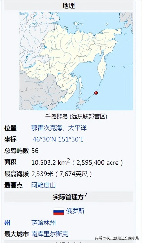 千岛群岛全境现为俄罗斯实际控制,隶属于萨哈林州北库里尔斯克、库里尔斯克、南库里尔斯克三个县管辖。南千岛群岛为俄罗斯与日本的争议领土,这些争议岛屿包括择捉岛(伊图鲁普岛)、国后岛(库纳希尔岛)、色丹岛(希科坦岛)、齿舞群岛(哈伯迈群岛),被日本称为“北方四岛”。中国人对萨哈林岛的称呼“苦夷”和“库页”。