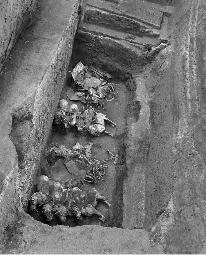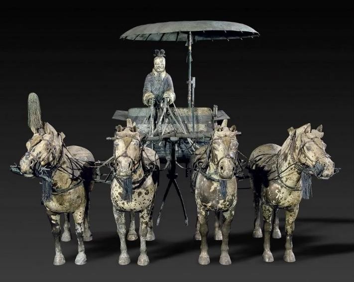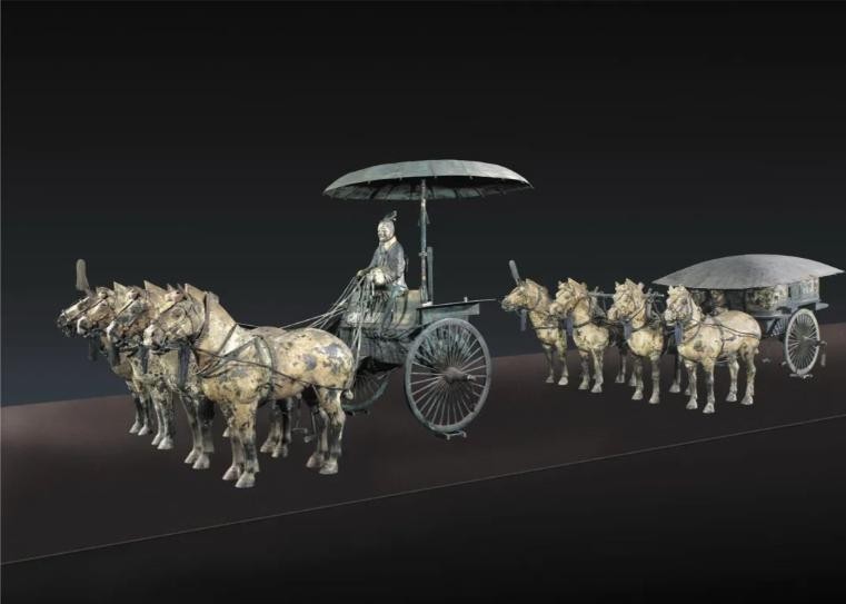 秦陵铜车马于1978年6月在秦始皇帝陵封土西侧约20米的地方勘探出土,共两辆,逼真再现了秦始皇御用马车的全貌,反映了秦代工匠运用高超的铸造技术,对中国的古代车马文化的研究具有划时代的意义。