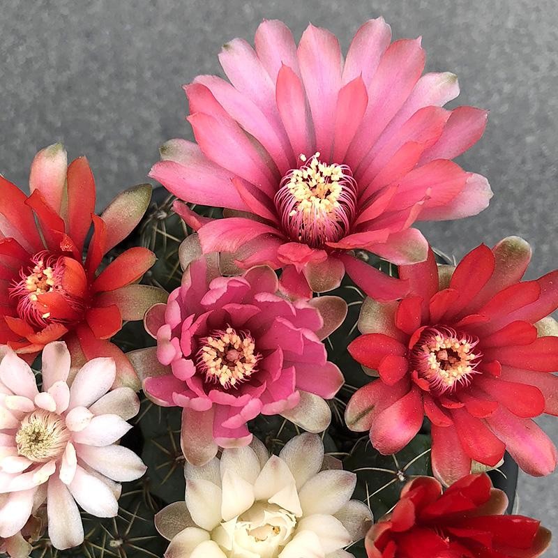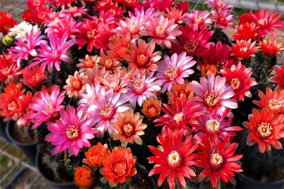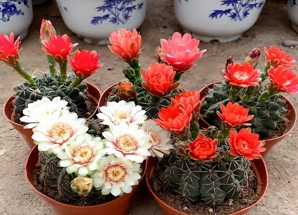 绯花玉的花朵通常长在球体的顶部位置,它一般会在夏季开花,花色也非常地丰富,白色、粉色、白绿、深红等等,不一而足,五彩纷呈。它是仙人球界里妥妥的开花机器,通常花期在5-11月份。