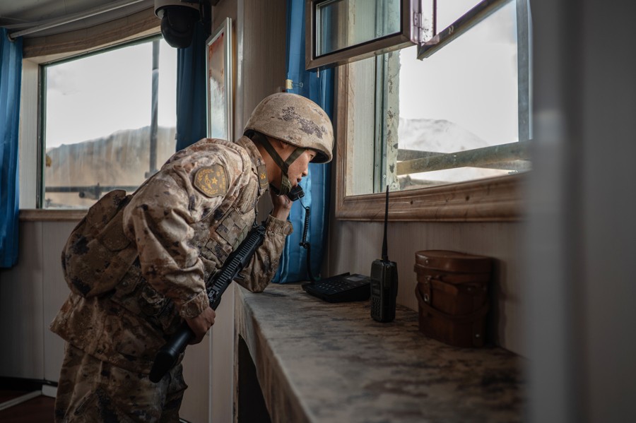 神仙湾边防连行政区隶属于和田地区皮山县,南距中印巴三国交界点。在神仙湾边防连的前哨楼里,去年刚刚入伍,一个月前被派往神仙湾的年轻战士关严旭正在站哨。海拔5000米之上,空气稀薄,说话都费力,战士们全副武装执勤,一站就是一个多小时。