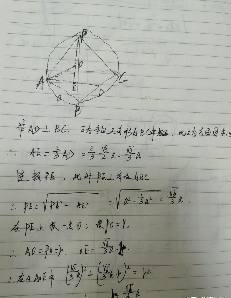 然后在PE上取一点O,则PO=AO=r,oE=三分之根号6a-r,利用勾股定理。