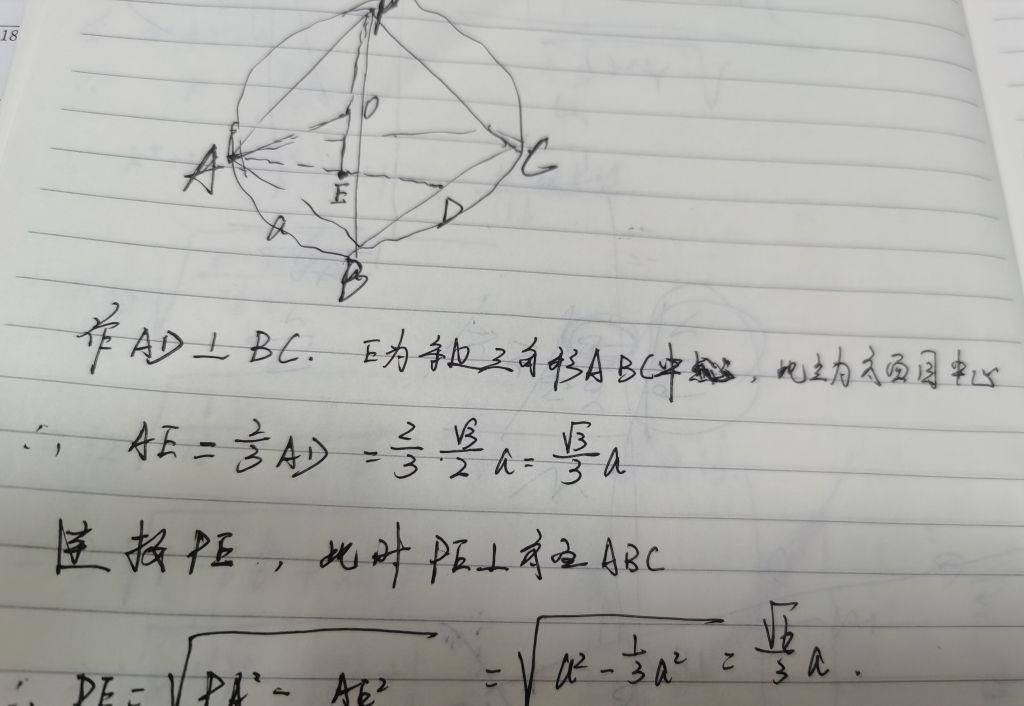 然后在高AD上取点E,使AE=2DE,E为等边三角形ABC的中心,底面外接圆的圆心,连接PE,则pe垂直底面。