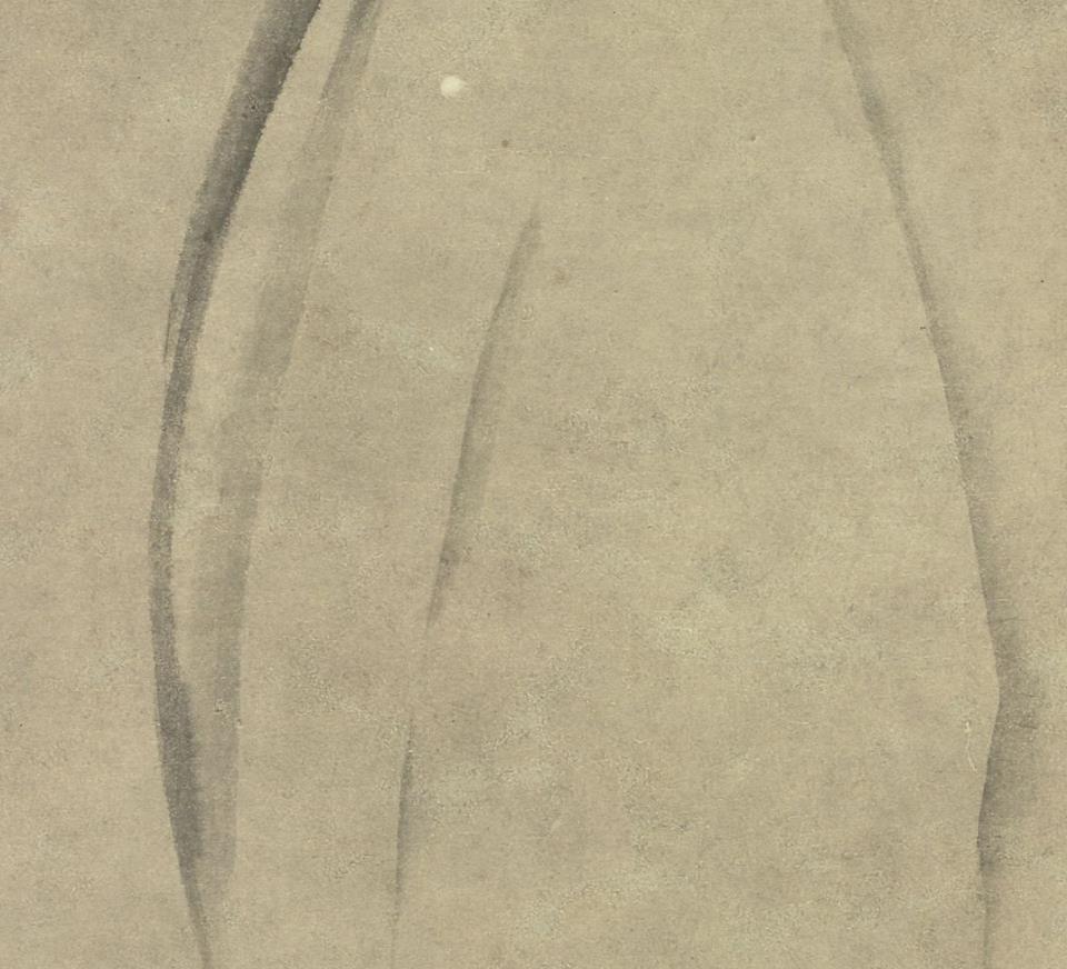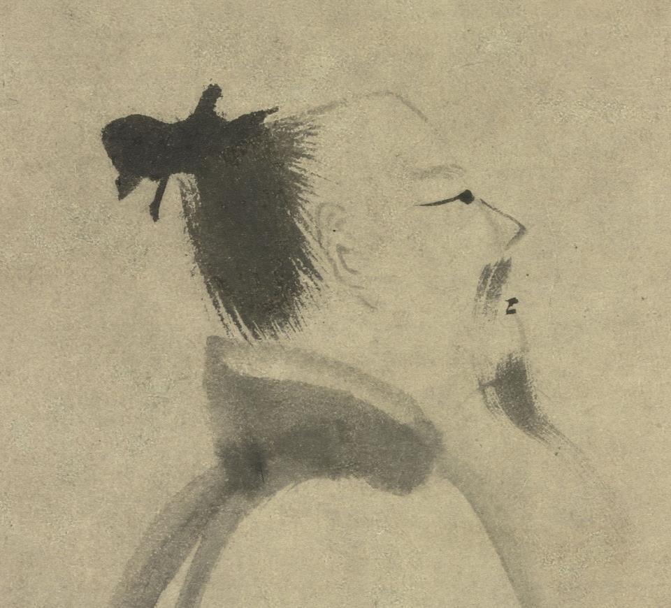 图中的李白侧身而立,只用了几乎数得出的几根线条,略加粗细浓淡的变化就完成了。而就是这寥寥数笔,将诗人疏放不羁的个性,以及边吟边行的姿态刻划得生动传神,令人叫绝。