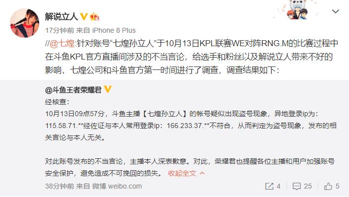 今天斗鱼王者荣耀君对于账号“七煌孙立人”于10月13日KPL联赛WE对阵RNG.M的比赛过程中在斗鱼KPL官方直播间涉及的不当言论作出回应,称疑似出现盗号现象。原文如下: