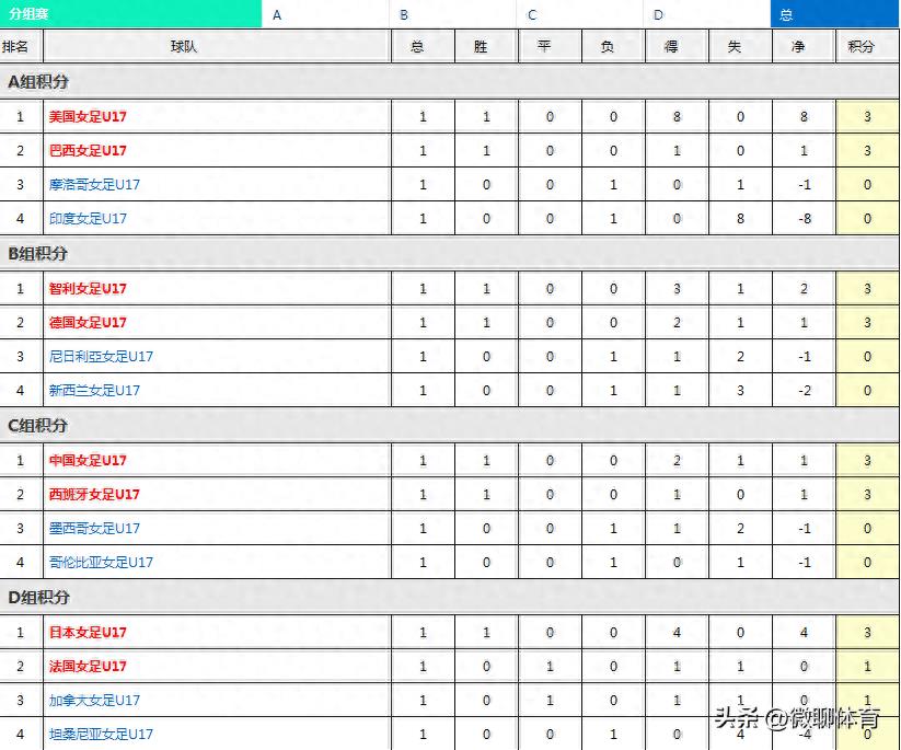 女足U17世界杯积分榜:中西巴美德日智利开门红,东道主8球惨败