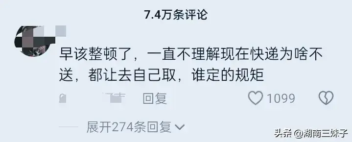 有网友说:“早该整顿了,一直不理解现在快递为啥不送,都让去自己取,谁定的规矩。”