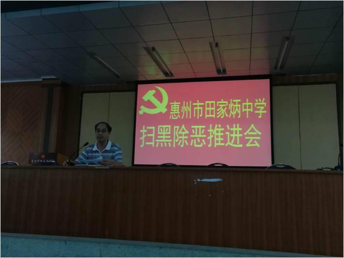 为了深入贯彻落实党的十九大精神,切实保护全体师生的合法权益,切实维护学校的稳定,根据“扫黑除恶”专项斗争工作精神,惠州市田家炳中学积极开展了“扫黑除恶”专项斗争的部署工作,各项工作稳步推进。