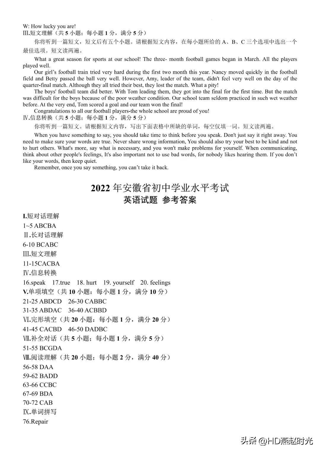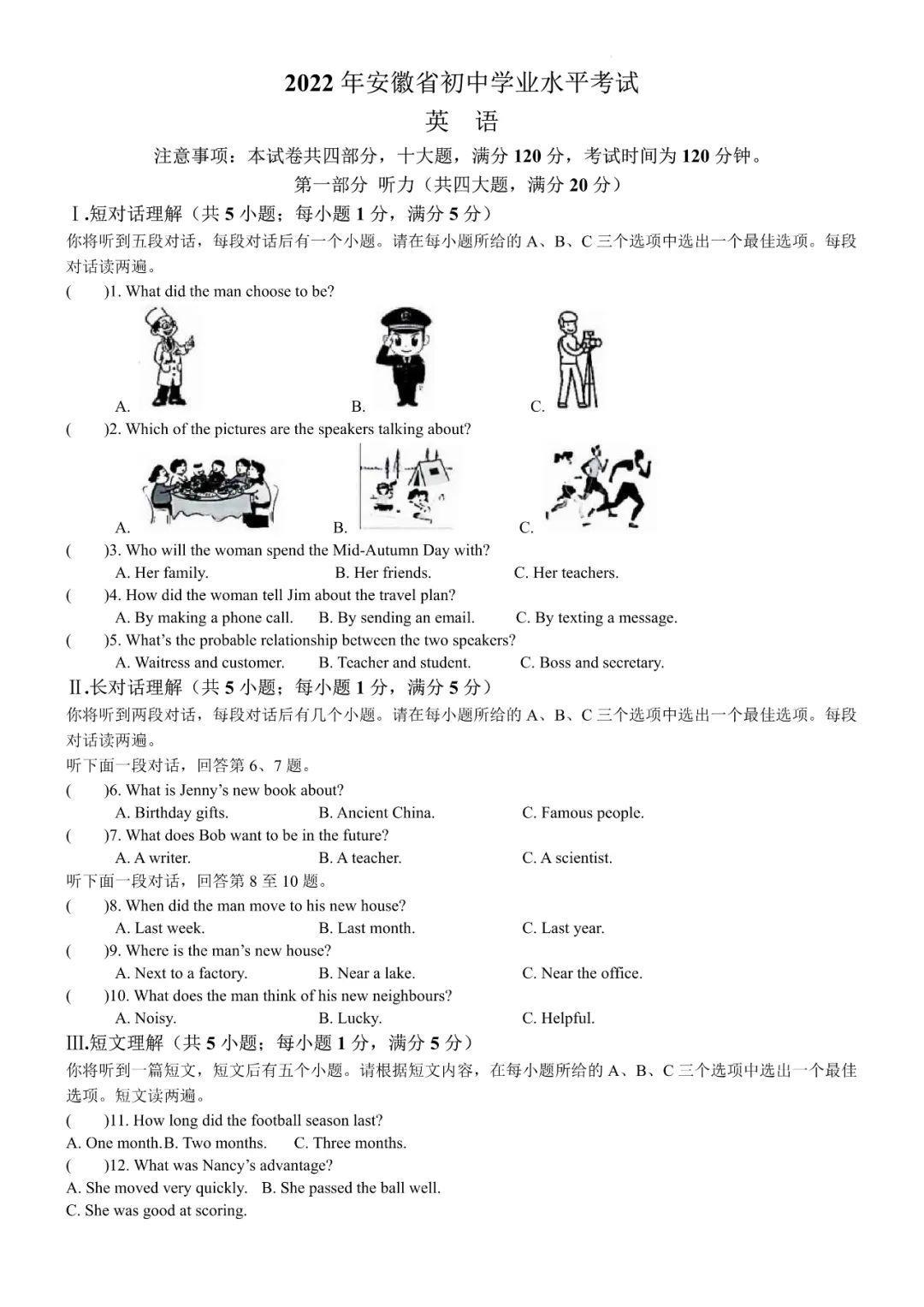 中考篇|2022年安徽省中考英语真题(含听力 答案)