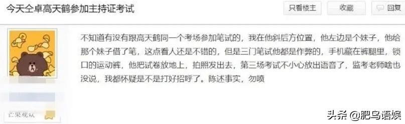 有网友半年前就在网上爆料,说高天鹤在考主持人证的时候,三门笔试都做手脚了,手机在裤子里还放出了语音。然而,这条半年前的帖子最近却莫名其妙被删除了,恰好高天鹤又被P掉了。这就让很多瓜友不免怀疑,高天鹤是不是也走上了仝卓的老路?