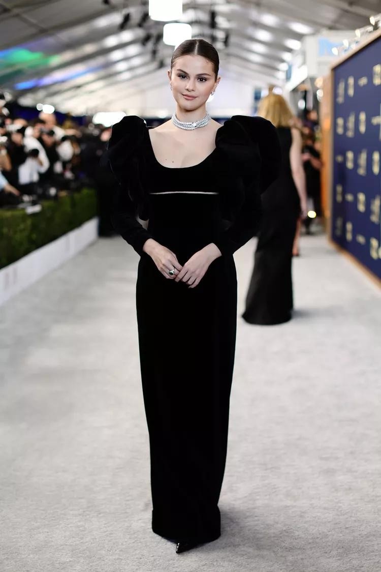 尽管获得了提名,戈麦斯没有参加去年的颁奖典礼,而她的搭档卡拉·迪瓦伊和阿什利·帕克则代表了整个团队。然而,在2022年的颁奖典礼上,戈麦斯穿着一件醒目的黑色天鹅绒圆柱礼服,上腹部开衩和夸张的蓬松肩膀。