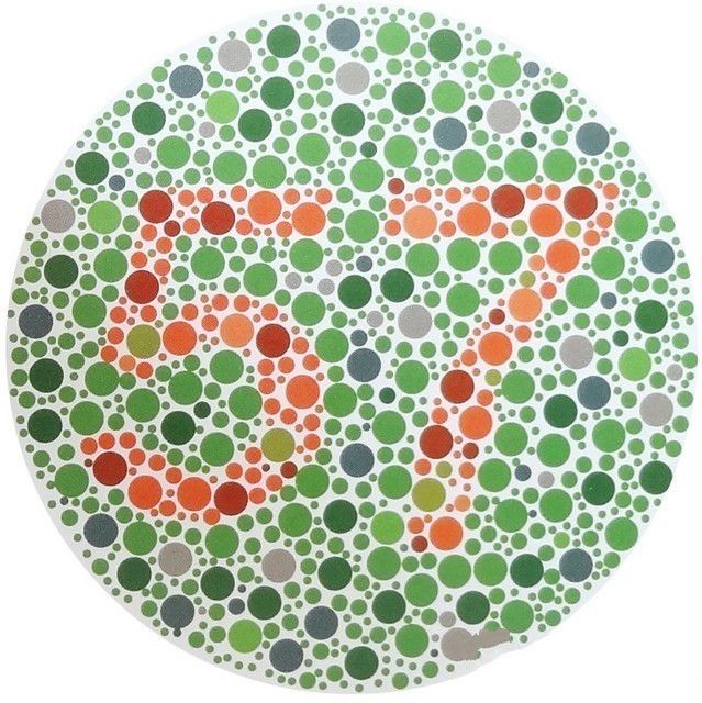 第三幅图检测的是红色色弱,而在这幅图中我们可以看到的是两个阿拉伯数字,数字是57,它是由红色的圆点组成,背景颜色是绿色的圆点,红色和绿色,他们之间是不同的色系,所以这幅图在色差让是比较大的。所以也就比较好识别一些。