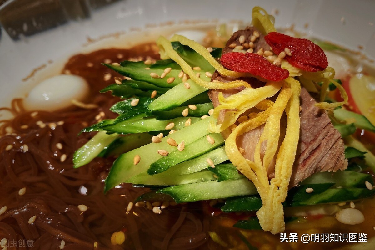 延吉冷面起源于吉林延边地区,是朝鲜族传统小吃之一,酸甜可口。