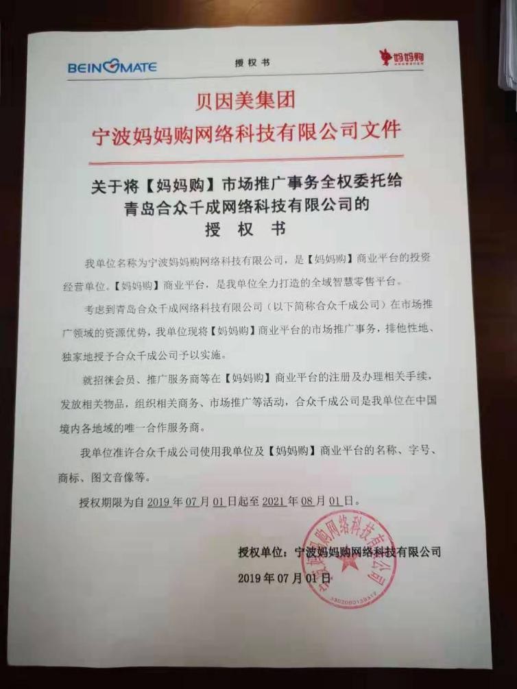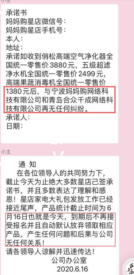 让姜女士没想到的是,今年6月,妈妈购平台市场推广事务的委托公司青岛合众千成网络科技有限公司在星店店主群发布通知称,由于“主体公司妈妈购打电话、发信息不回复”,只好以个人身份赠与每位星店店主价值7900余元的3台机器,同时要签署“解约协议”,承诺与妈妈购及合众千成公司“再无任何关系”。