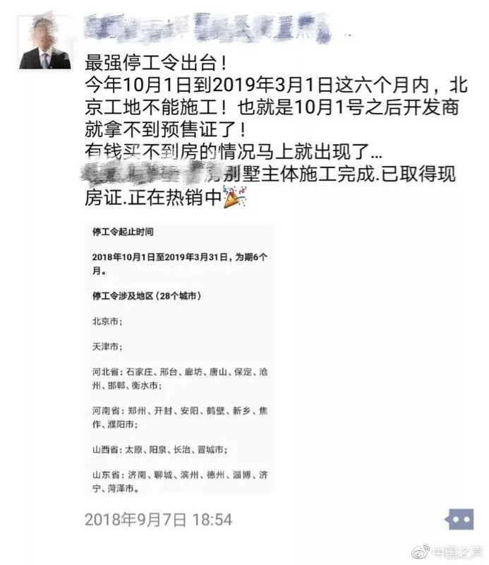 最近,不少房产销售和中介人员都在朋友圈转发这样一条消“最强停工令”:号称从今年10月1号到2019年3月31号这六个月内,京津冀以及周边地区的工地将不能施工!有房产销售和中介还说,10月1号之后开发商就拿不到预售证了!有钱买不到房的情况马上就出现了。