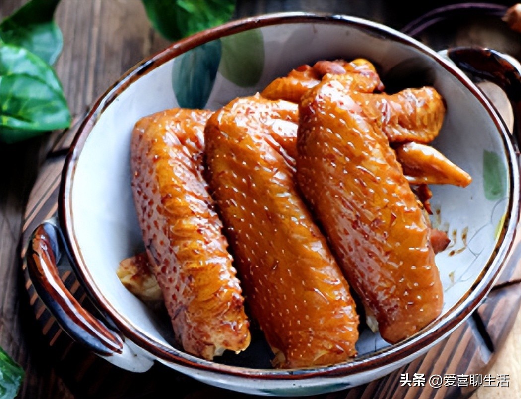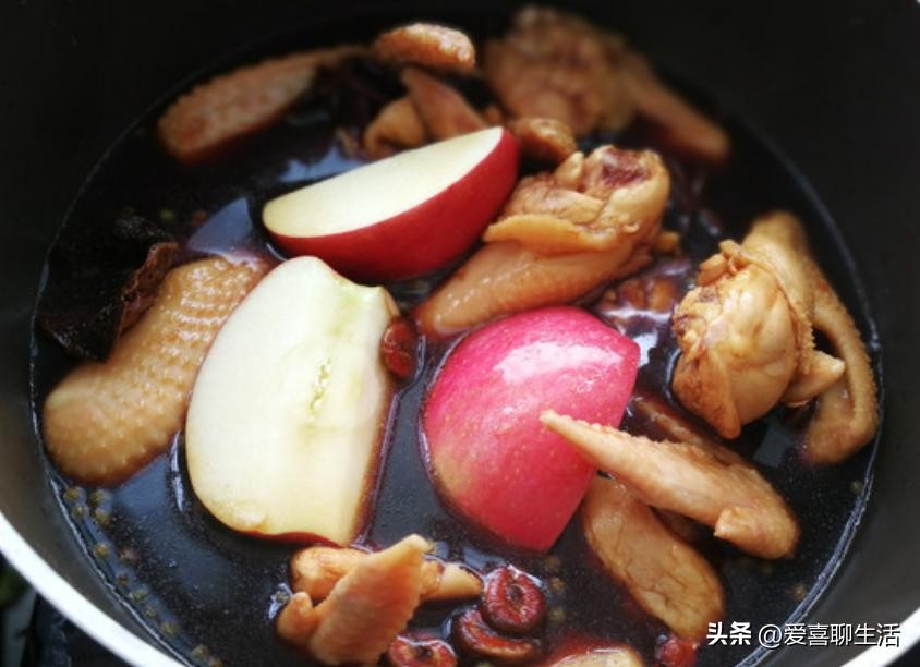 3,鸡翅放完三次后,第四次放回锅内,加入切好的苹果,开盖大火烧开后,转小火煮20分钟关火,不要立马取出,让它浸泡在汤汁中2小时以上。2小时后取出鸡翅,在上面涂上少许蜂蜜,即可上桌享用。
