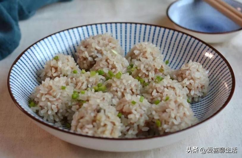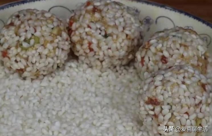 2,接着,戴上一次性手套,抓一小团肉馅,放在手心摔打团圆,然后放入糯米中滚一下,再搓圆后,放入盘中备用。