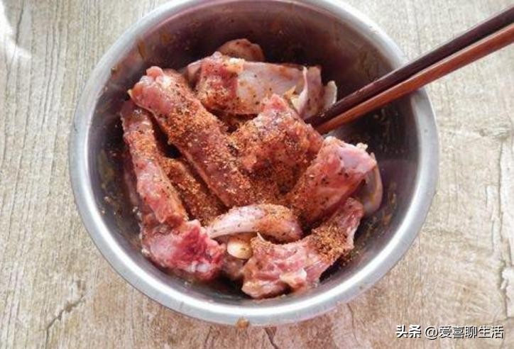 操作步骤:1,排骨浸泡出血水后,控干水分,放入大盆中,加入食盐,香葱,老姜,料酒,生抽,老抽,白糖,椒盐粉,抓拌均匀,腌制一小时入味。