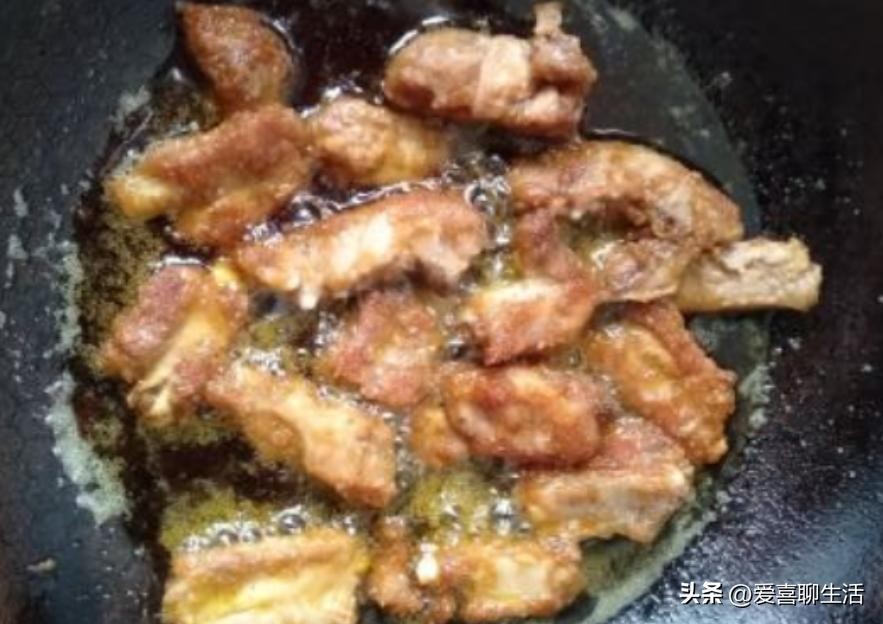 2,一个小时后,锅中加入食用油,油热放入腌制好的排骨,炸至熟透后捞出。