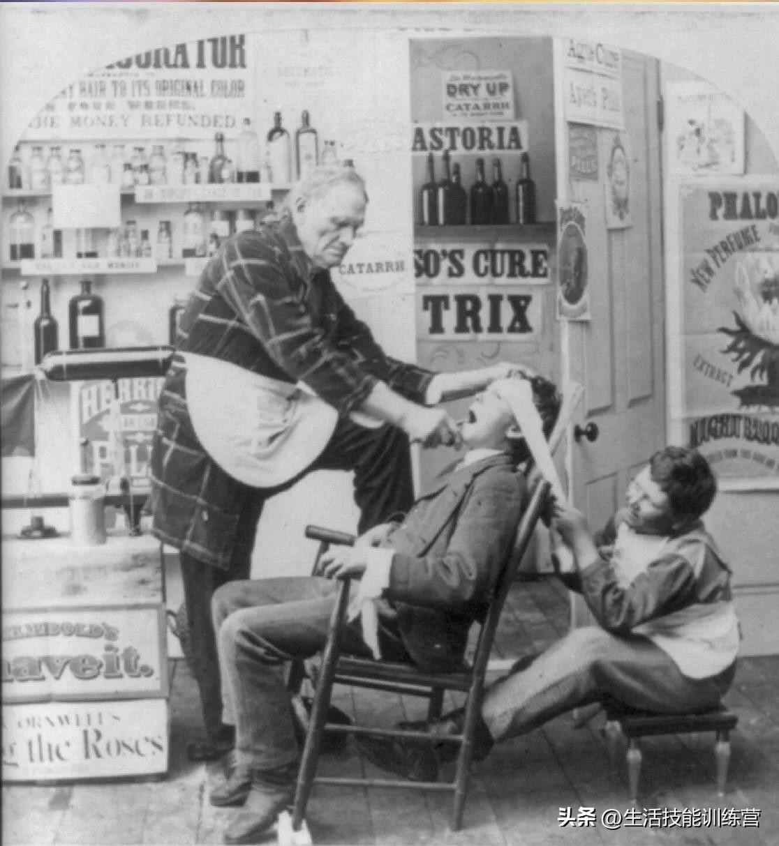 1872 年,一家酒品店里正在拔牙。一名助手用毛巾固定患者的头部,而“牙医”则用钳子拔牙。
