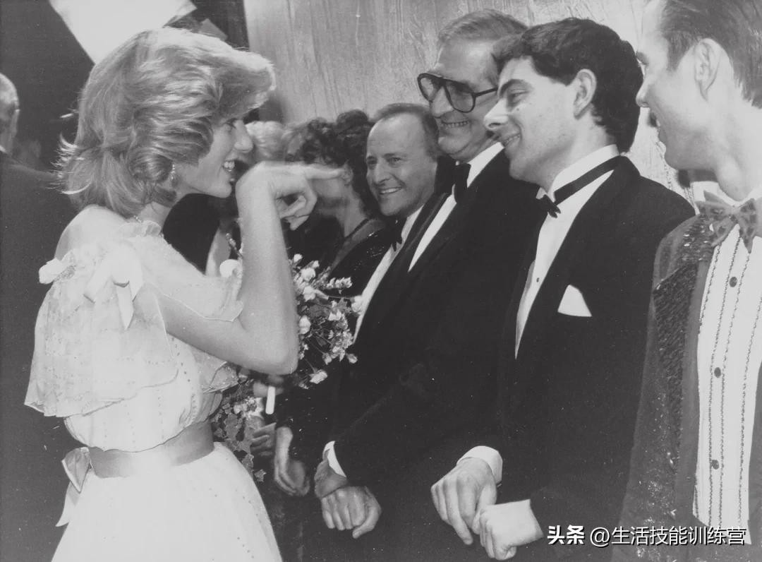 1984 年,戴安娜王妃在向“皇家综艺”节目的演员们致意时会见了喜剧演员罗温·阿特金森。