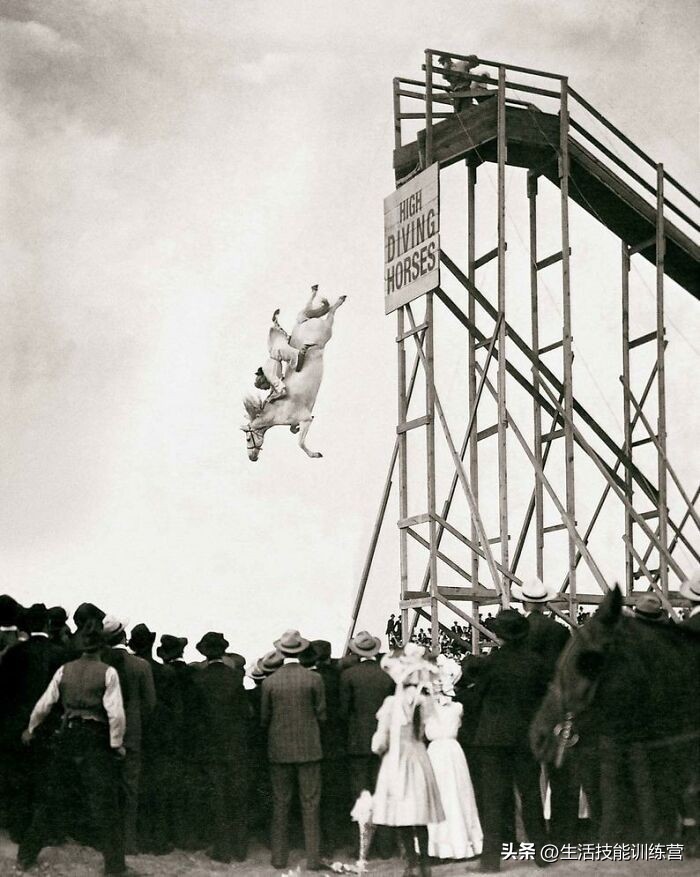 1905 年 7 月 4 日,观众在一个未知的地点观看骑马跳水表演